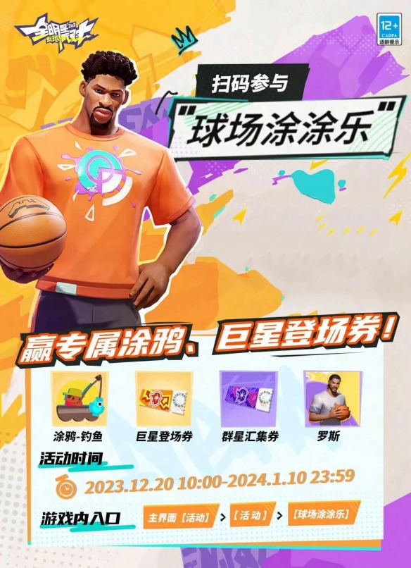 为了让街球玩家有更好的体验,轻松获得更多资源,《全明星街球派对》在新赛季推出了“宫廷画趣”活动。扫描二维码进入活动界面,绑定角色并完成邀请/助攻等日常及限定任务,获得对应涂鸦罐,装饰赛场,获得限量涂鸦、巨星出场券、明星等海量好礼收集门票等