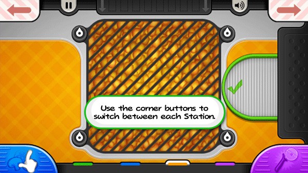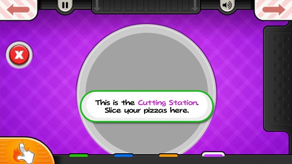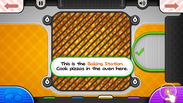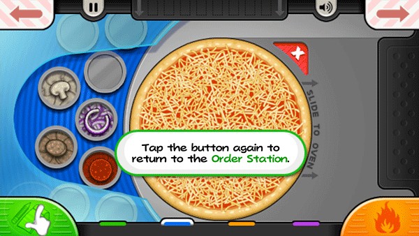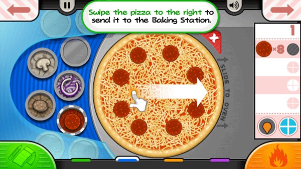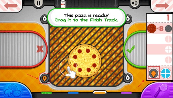 9、烤披萨的时候,记得要注意火候。当左下角的“火”变成橙色时,就可以将披萨拖到切割站进行切割;