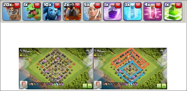 2。确定女王的路线后,释放战车和野蛮人国王,协助女王进入编队,杀死增援部队,摧毁鸟大炮,多头地狱塔,防空大炮和其他主要建筑。