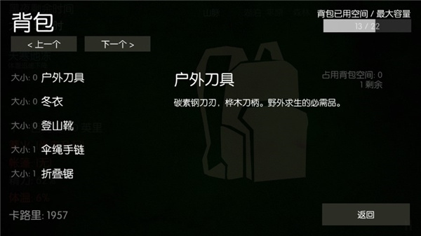 野外求生之旅最新汉化版本是一款模拟和商业手机游戏,其主题是户外生存。玩家需要依靠手中有限的资源来帮助角色生存并抵抗严酷的自然环境。尽管面临艰巨的挑战,但游戏本身还是很有趣!这些内容呈现给文本中的玩家,面临着新的季节性变化挑战,一些任务要求玩家合理地匹配道具。在这个游戏中,将对玩家的生存能力,思维水平和野生生存知识进行大力测试。