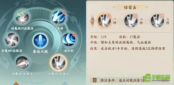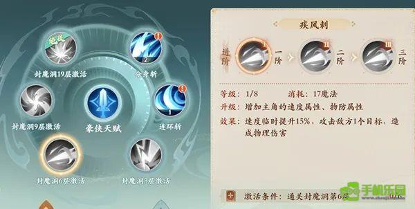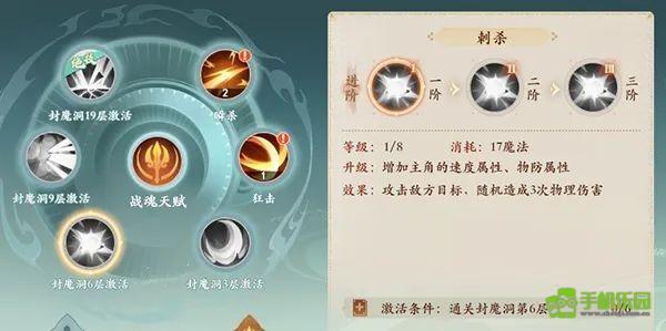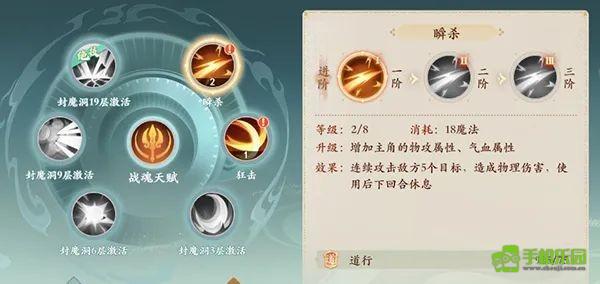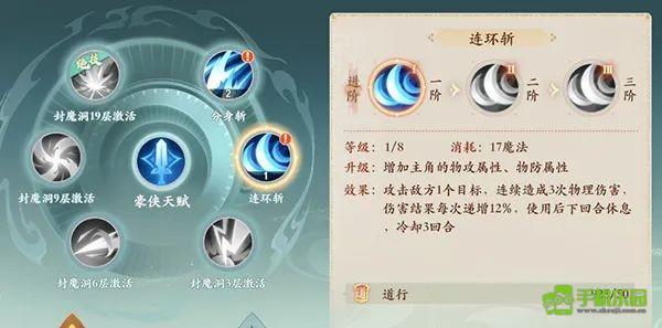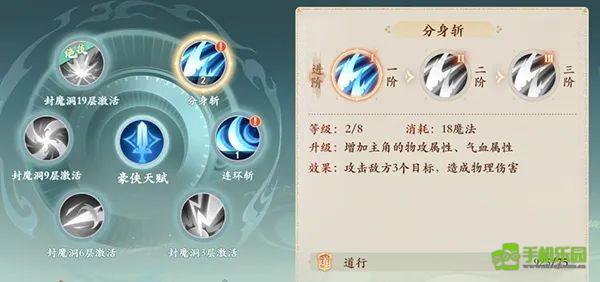 1技能:分身斩,组3目标。 (2级:增加1个目标,3级:技能伤害效果额外增加10%)