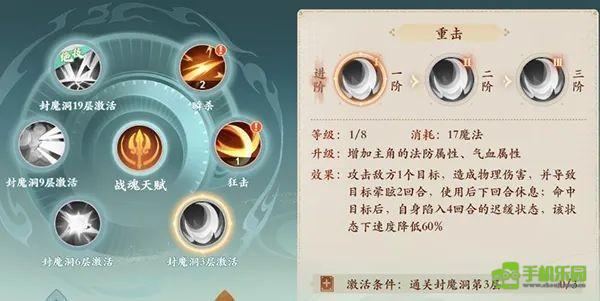 技能三:重击,单个目标晕眩2回合。命中后速度降低60%,持续4回合,并休息1回合。 (2级:速度暂时增加10%,3级:缓慢减少1回合)