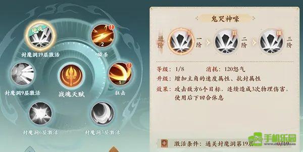 六技能:鬼哭狼嚎(怒气技能消耗120怒气):对6个目标,造成连续3次物理伤害,休息一轮。 (2级:次要目标优先攻击生命值较少的单位,3级:多增加1个目标)