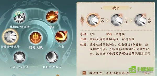 技能5:破甲,速度暂时降低30%,回合结束时清除,并施加破甲状态,持续3回合,受到的物理伤害增加20%。 (2级,穿甲状态额外增加1回合;3级,穿甲状态额外增加10%伤害)