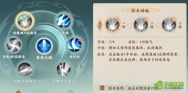 技能6:惊天动地(怒气技能消耗110怒气):对单个目标造成5点物理伤害,不受反击,休息一轮(2级:命中率提升10%,3级:物理伤害提升1倍)