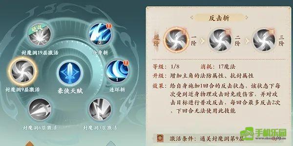 技能5:反击,发挥反击状态1回合,每次免疫近战物理攻击伤害,并以普通攻击进行反击,每回合最多反击2次,技能冷却2回合(2级:反击次数+1,3级:技能伤害效果额外增加10%)