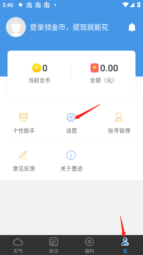1。首先,您需要在Duoduo软件站下载并安装Moji天气的速度版本,然后单击以输入我的界面并单击设置。