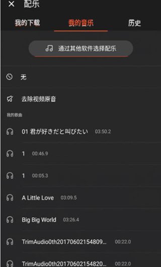 单击歌曲名称(或添加音乐按钮)以输入配乐界面。 [我的下载] [我的音乐]分别在手机上显示了从Lexiu和本地音乐下载的音乐。