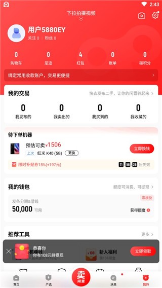 1。首先在手机上打开Zhuanzhuan应用程序,输入主页,然后在右下角单击我的选项。