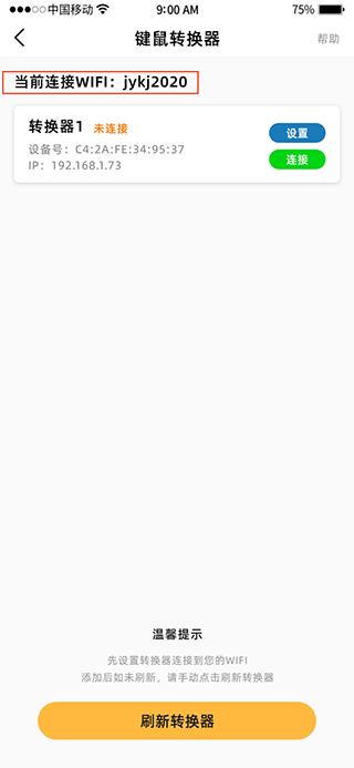 返回APP查看键鼠转换器是否成功连接WIFI,如图(连接成功但未出现转换器,请点击【刷新转换器】按钮)。这时候重新连接就可以在云电脑/云游戏中使用键盘和鼠标了~